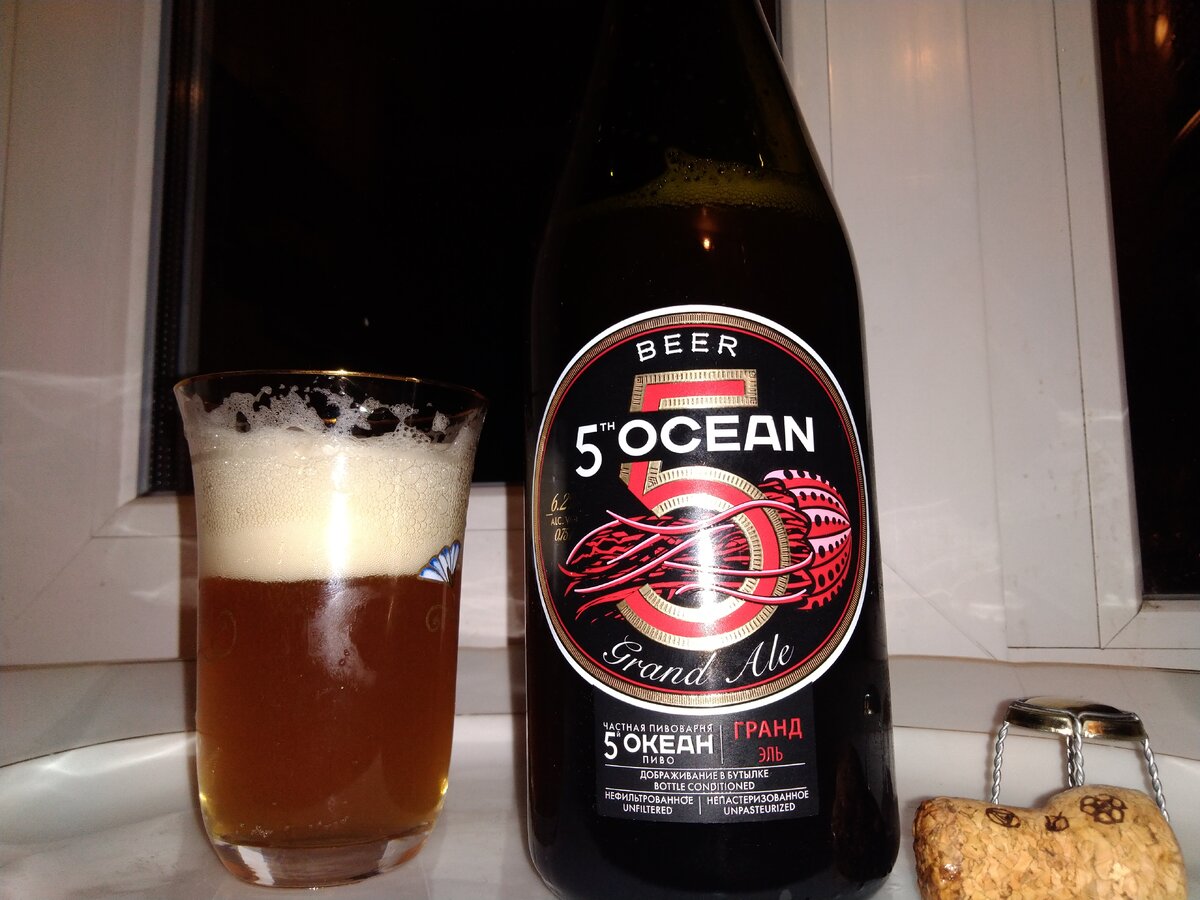 Захотелось нам с Кисой Воробьяниновым немного поэстетствовать. И записать обзор на какое-нибуть не совсем обычное пиво, при этом, чтобы обязательно бюджетно. С этими мыслями мы и зашли в один из магазинов "Пив&Ко", коих в "Славном граде Екатерины", на одном только Уралмаше, находится штук пять, а может даже уже и шесть или семь. Зайдя во внутрь и немного осмотревшись, направились к витрине с "заморским" пивом, и здесь Ипполита Матвеевича чуть было не "хватил" удар. Увидев цены, жадный старик начал клянчить:"Сдалось нам это эстетство? Давай лучше возьмем что-нибуть более доступное. Например, из "Чувашского" что-нибуть или на худой конец "Франца Клинку" перепробуем за 29 рублей, вдруг он вкуснее стал?". Почти уже согласившись с голосом моего внутреннего Кисы Воробьянинова я вдруг увидел интересную бутылочку стоимостью всего 149 рублей 90 копеек... На этикетке была нарисована медуза, а надпись гласила "5th Ocean Grand Ale". Пиво "Пятый Океан" мы уже брали в "Фикс Прайсе" и оно нам сов