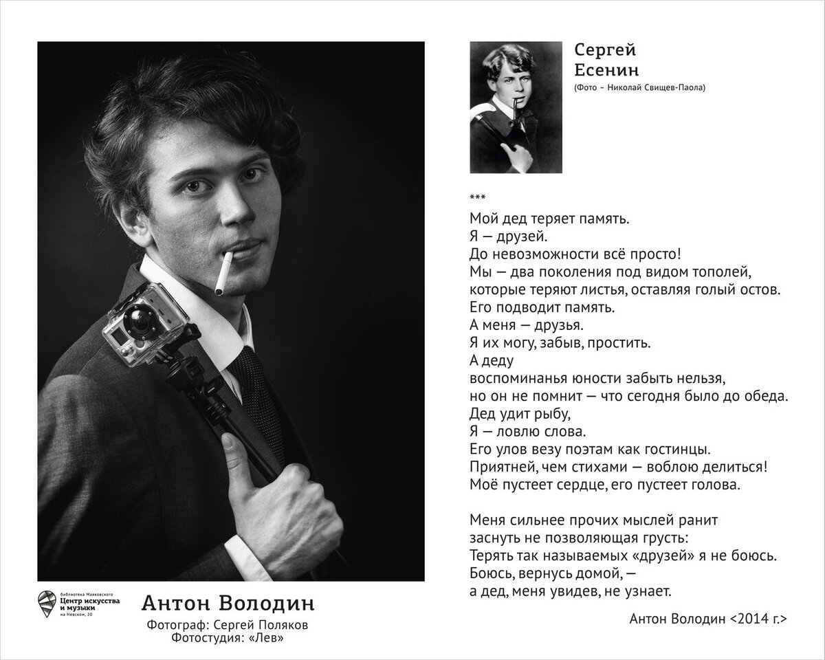 Новая рубрика моего нового блога *смайл* [nostalgie] Мог ли современный Сергей Есенин обойтись без палки для сэлфи? Носил бы сегодняшний Борис Пастернак велоперчатки? Современные петербургские поэты поразмышляли над тем, какими бы сегодня были привычные нам поэтические кумиры первой половины XX века. Они не просто примерили на себя образы Маяковского или Ахматовой, но вложили им в руки новые детали – свидетели сегодняшней эпохи.