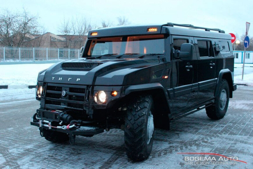 Огромный черный внедорожник устрашающего вида, который вы видите на фотографиях, с трудом идентифицируется, как «Тигр» — тот самый армейский бронированный автомобиль, используемый самыми разными силовыми структурами. Но вы точно будете полностью дезориентированы, если откроете глаза в салоне автомобиля — такую роскошь можно найти разве что в автомобилях Mercedes-Maybach. Серьезную доработку внедорожника «Тигр» провела московская мастерская с пафосным названием «Богема Авто». Судя по всему, ни один элемент экстерьера и интерьера не остался без внимания. Внедорожник получил новый капот, решетку радиатора, блоки-фар, накладки на колесные арки, молдинги на бортах, накладки на передние стойки крыши, козырек над лобовым стеклом, а также заднюю светодиодную оптику, которая сделала «Тигр» похожим на Hummer H2. Можно смело сказать, что внешне автомобиль преобразился на 100%, став именно таким, каким его хотят видеть богатые покупатели. Но даже после такого эксклюзивного экстерьера не ожидаешь