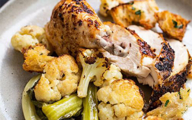 Переложить цветную капусту на сервировочное блюдо. Дайте курице отдохнуть 10 минут перед резьбой на разделочной доске. Переложить курицу на сервировочное блюдо с цветной капустой.