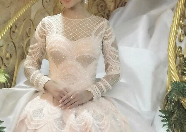 В качестве фона на свадьбе был искусственный замок и свадебный торт высотой с человека. Но что действительно привлекло внимание социальных медиа это платье, в котором фигурируют длинные рукава и высокий вырез, украшенный тысячами жемчужин.