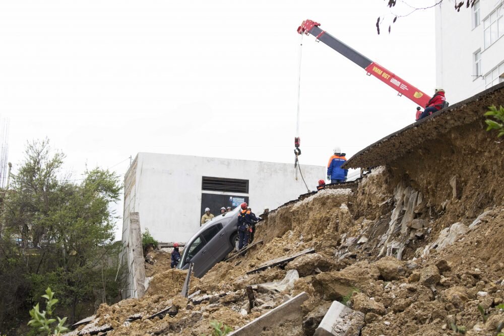 Сегодня в 6 утра возле дома по адресу проспект Победы 2 произошло обрушение площадки, отведённой для парковки автомобилей. Стена, державшая склон, рухнула вместе с припаркованными на стоянке автомобилями. Пострадало четыре машины, три из которых отделались незначительными повреждениями. Больше всех не повезло девушке Оксане, чей автомобиль оказался в самом эпицентре обрушения и пролежал на крыше около пяти часов. По словам пострадавшей, жильцы дома неоднократно звонили и писали в управляющую компанию, обращая внимание на огромную трещину в асфальте и требуя принять меры по ее устранению. По предварительным сведениям, обрушение стены произошло из-за нарушений, допущенных при её возведении. Одно из грубейших — отсутствие дренажных отверстий, позволяющих выходить влаге, собравшейся в почве после осадков. По словам сотрудников спасательной службы, это не единственное нарушение, которое вскрылось после обвала, но самое фатальное. На фото отчётливо видна трещина в асфальте, которую сотрудни