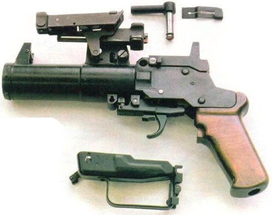 По моему мнению это самый популярный и узнаваемый подствольник СССР. После появления на вооружении у армии США подствольного гранатомета М203, у наших военных появилось запоздалое желание иметь нечто подобное. Разработка подствольного гранатомета для расширения боевых возможностей пехоты была начата в СССР в 1975 году. В основу разработок был положен опыт, полученный во второй половине 1960-х годов при создании экспериментальных подствольных гранатомётов по теме «Искра». На вооружение подствольный гранатомет ГП 25 «Костер» был принят в 1978 г. и по сей день остаётся в нашей армии. Гранатомет использует гранаты ВО-25 или ВОГ-25П имеет самовзводный ударно спусковой механизм куркового типа с флажковым предохранителем, запирающим курок. На цевье автомата гранатомет крепится кронштейном с ограждением и фиксируется защелкой.