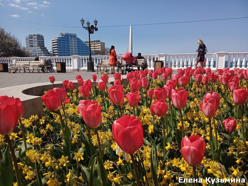 В этом году наши власти расстарались на славу!!! Высажено 320 тысяч луковичных цветов. Представляете???!!! Везде, на всех клумбах, в том числе и в спальных районах у нас цветут нарциссы, тюльпаны и гиацинты В начале апреля я прогулялась по центру города и получила огромное удовольствие от увиденной красоты!!!! Началась прогулка от остановки "ДОФ". Тут высажена шикарная клумба с тюльпанами. Это начало цветения. Сейчас цветут все цветы На площади Нахимова клумбы засажены гиацинтами. Аромат такой стоит!! Шикарные , махровые гиацинты На самой площади снова устроили автостоянку, но часть площади выделили под лаундж-зону. Поставили тут остролисты в кадках. Смотрится очень здорово, но интересно, как они переживут наше жаркое лето.. Дальше наш путь лежал на Приморский бульвар. Тут сейчас цветут не только тюльпаны, но и маргаритки, гиацинты,нарциссы, мускарики и еще какие-то цветы, названия которых я не знаю... Идем к тюльпановым клумбам Тут тюльпаны высажены с какими-то чудными , маленькими н