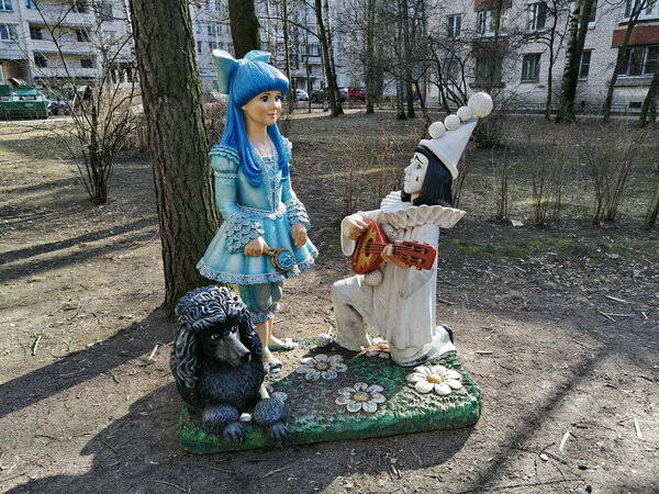 В последние годы в Петербурге появилось множество затейливо украшенных дворов. В частности, есть в городе на Неве и несколько мультяшных двориков. Об одном из таких дворов, который расположен в центре Северной столице, я уже рассказывала, теперь хочу познакомить читателей с еще одним местом, где живет сказка. Среди обычных пятиэтажек в Василеостровском районе города, буквально в паре минутах ходьбы от станции метро "Приморская", притаились сказочные персонажи из любимых с детства мультфильмов. Здесь можно встретить героев «Простоквашино» Почтальона Печкина и кота Матроскина, полюбоваться на синеволосую Мальвину и вечно грустного Арлекино. Также взрослые и дети могут пощупать за нос Буратино, поинтересоваться, сколько лет черепахе Тортилле, куда летает в своей ступе Баба Яга и какие лекарства назначает Доктор Айболит. В общем, простор для детской и даже взрослой фантазии безграничный. А главное - во двор, где находятся все эти сказочные персонажи может попасть любой желающий: здесь не