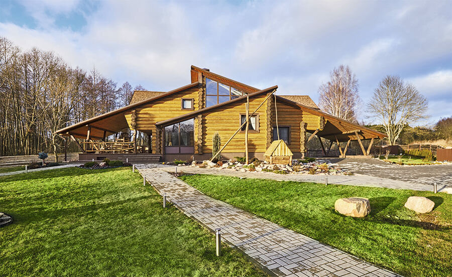 Бревенчатый дом-шале в окружении леса Авторы проекта: архитектор-дизайнер Александр Трусов (студия «Четвертый квартал») при участии архитектора Д. Филатова, г. Минск История этого дома началась еще в 2006 году, когда был сделан проект, а реализовать его удалось только в 2014-м. Заказчик, для которого отдых ассоциируется исключительно с рыбалкой и охотой, мечтал о капитальном, но нестандартном с архитектурной точки зрения строении, возведенном в окружении леса на берегу реки. Несмотря на то, что процесс растянулся на годы, долгое ожидание себя оправдало. Первый этаж дома занимает единое пространство холла, гостиной, кухни-столовой, а также спальня с гардеробной, санузлом и бойлерная с постирочной. Зону отдыха от кухни условно отделяет индивидуально сделанная стойка, на которой расположена телевизионная панель. Печь-камин с остекленной топкой облицован изразцами. Так как стальной заводской дымоход слишком блестел и никак не вписывался в интерьер, его оковали медью. В обществен