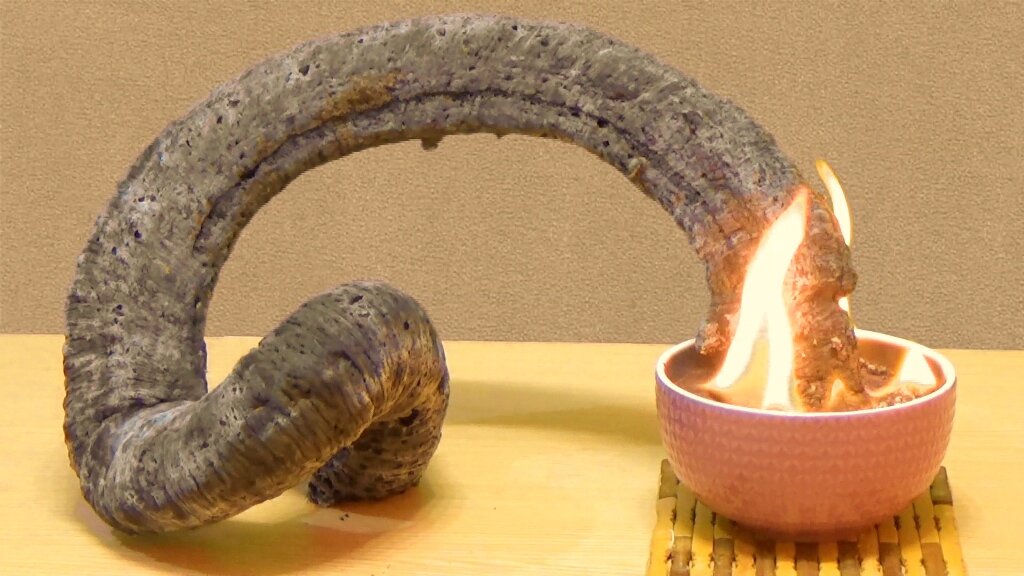 Поджигаем спирт (это может занять некоторое время). Постепенно смесь начнет превращаться в черные шарики, а после того как весь спирт прогорит, смесь резко почернеет и из неё начнет выползать фараонова змея!