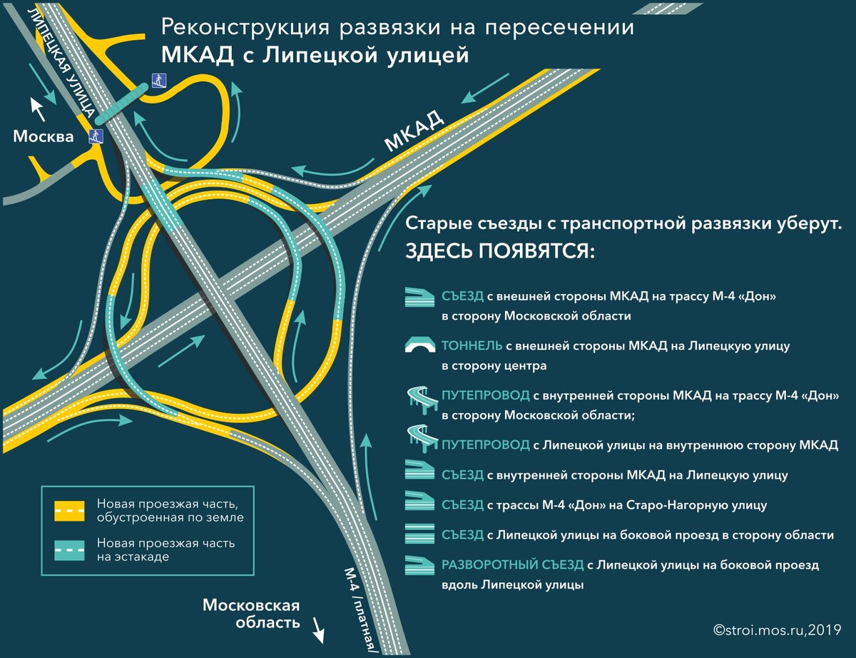 На пересечении МКАД с Липецкой улицей действует старая развязка клеверного типа. Она плохо справляется с большим потоком транспорта, поэтому здесь часто приходится стоять в пробке. Развязку модернизирут, построят направленные съезды – эстакады, путепроводы, тоннели. Также реконструируют участок МКАД от Каширского до Варшавского шоссе. Старые съезды с транспортной развязки уберут. Здесь появятся: На Липецкой улице при движении в сторону Московской области обустроят площадки для досмотра транспортных средств. Переустроят отстойно-разворотную площадку «Загорье». Участок МКАД от Каширского до Варшавского шоссе реконструируют. Его длина составляет 7,2 км. Здесь обустроят переходно-скоростные полосы, построят боковые проезды с внутренней и внешней стороны МКАД. С внешней стороны МКАД появится съезд к дер. Ближние Прудищи Ленинского района Московской области. Построят пять новых пешеходных переходов. Четыре из них через МКАД: Еще один переход возведут через Липецкую улицу. Вдоль внутренней с
