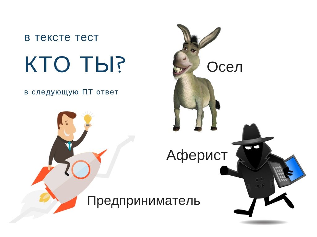 3. Предприниматель Надо четко понимать, если ты сейчас осел - это не повод обижаться на мир, это повод развить в себе новый тип мышления ПОЕХАЛИ! ВОПРОС#1 У тебя сейчас нет бизнеса, знаний о нем, есть какие-то люди из Соц сетей, которые транслируют жизнь. Тебе кажется она более привлекательной. Твои действия?