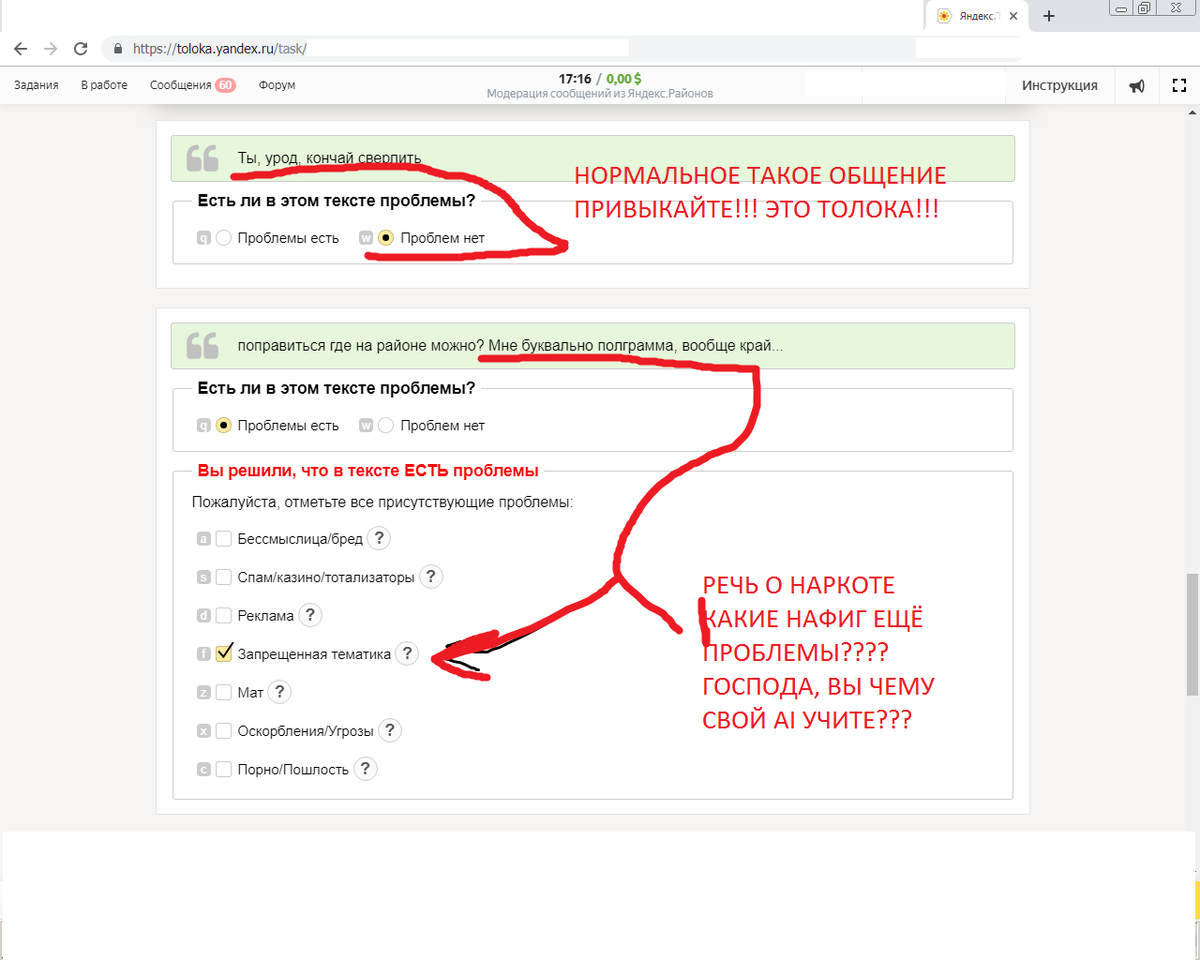 Абсурд толоки. Яндекс переучивает пользователей смотреть на мир под нужным углом? Не буду повторять официальную версию идеи запуска сервиса Яндекс.Толока Не буду приводить хвалебные статьи "О том как с ноутбуком сидя дома с маленьким ребёнком заработать много бла-бла" , а так же о курсах заработка на Толоке "почти даром" за 990 рублей. Озвучу собственное мнение. Что мы имеем по факту? Отбросим варианты, где надо кого-то считать, делать видео и подтверждать адрес организаций. Речь о взглядах на окружающий мир и сетевой с точки зрения рядового пользователя сервисами Яндекса, разве не так? Но в итоге мы наблюдаем разительное отличие от точек зрения пользователей. По сути, Толока навязывает пользователям свои взгляды и убеждения, отличные от позиций пользователей и здравого смысла. Возьмём премодерацию сообщений на районе - этакий тест Чёткая фраза, полграмма надо - речь о наркотиках, однозначно, Нет, надо бы чего то ещё добавить - маразм? Нет! Там вообще нет проблем! Также никаких