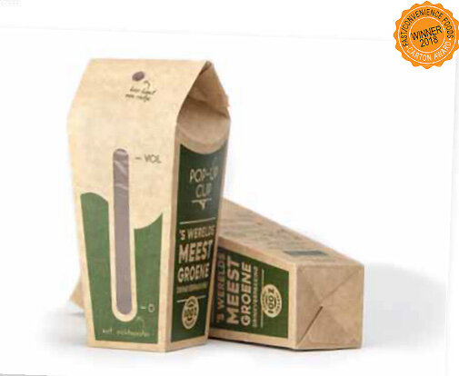 Победитель конкурса. Каждый год мы потребляем миллиарды одноразовых стаканчиков. Это оказывает огромное негативное воздействие на окружающую среду. Специальная упаковка для питья на ходу способна решить вопрос отходов. Конструкция представляет собой комбинацию складной коробки и полиэтиленового пакета. При переработке чашка может быть легко разделена на картонные и пластиковые компоненты для экологичной утилизации.