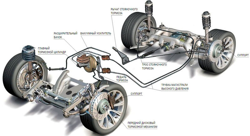 Современный гидропривод тормозов состоит из двух независимых контуров, связывающих между собой пару колес. При отказе одного из контуров, срабатывает второй, что обеспечивает, хотя и не очень эффективное, но все-таки торможение автомобиля.
