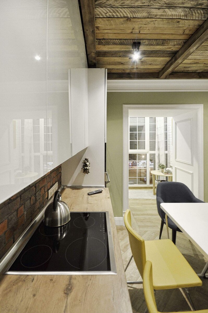 - Выполнена кухня из экологичных материалов, предпочтение было отдано - дереву, стеклу. В дополнении старая доска и кирпич на стенах.