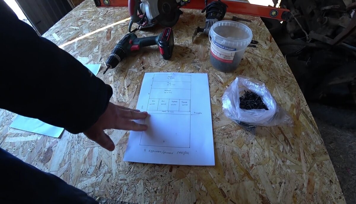 Всем привет сегодняшняя тема статьи изготовление гнёзд. Были приобретены листы ОСБ толщиной 9 мм, размером 244 на 122 см и рейка 20 на 40 мм. Из инструментов это шуруповерт, циркуляционная пила и резак. Размеры гнёзд: Гусиные это 60 см шириной 40 см глубиной 50 см высотой, куриные гнёзда будут на 4 места 30 см глубиной 40 см высотой и 30 см шириной. Всё в масштабе уже начерчено на листочках в формате А4 ну и так что бы вам по максимуму использовать весь лист ОСБ, и поменьше было всяких обрезков. Сейчас весь чертёж переношу на лист ОСБ расчерчиваю, размечаю и разрезаю. Лист распущен, дальше нарезаем рейку согласно всем размерам. Проще будет делать углы утопленными. Гнездо почти готово. Гнёзда буду подвешивать, для это я взял уголки ну только потому что я не нашёл пластинки, я их разогнул и сделаю петельки. Получается на одно гнездо ушёл почти лист ОСБ осталось только лишь на заднюю стенку для следующего гнезда и ещё осталось две рейки. Гнёзда повесили. Все там прекрасно ходят