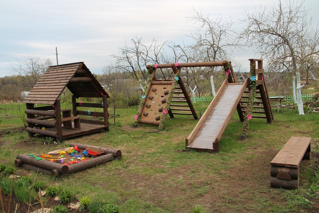 Если на вашей даче есть большое старое дерево, то вы мод ним обустроить отличную детскую площадку для игр. Это на самом деле идеальное место, так как крона дерева сможет защитить ребенка от солнечных лучей, а также от летних дождей. Не только ребенок, но и вся площадка будет защищена. И не волнуйтесь, что через пару лет, когда ребенок подрастет и не захочет играть на организованной для него площадке, это место будет пропадать зря. Нет, здесь вы сможете затем организовать уголок для прекрасного отдыха, всего лишь немного переделав песочницу и подиум для игр. Качели же со временем можно перестроить, сделав из них широкий навес, который начинается прямо от дома или перголу. А сама площадка, то есть выровненная земля – это отличное место для организации какой-либо новых сооружений. Следовательно, при обустройстве детской площадки для игр нужно использовать только качественные, долговечные материалы, например, брус и доски могут быть с автоклавной пропиткой. При строительстве площадки не