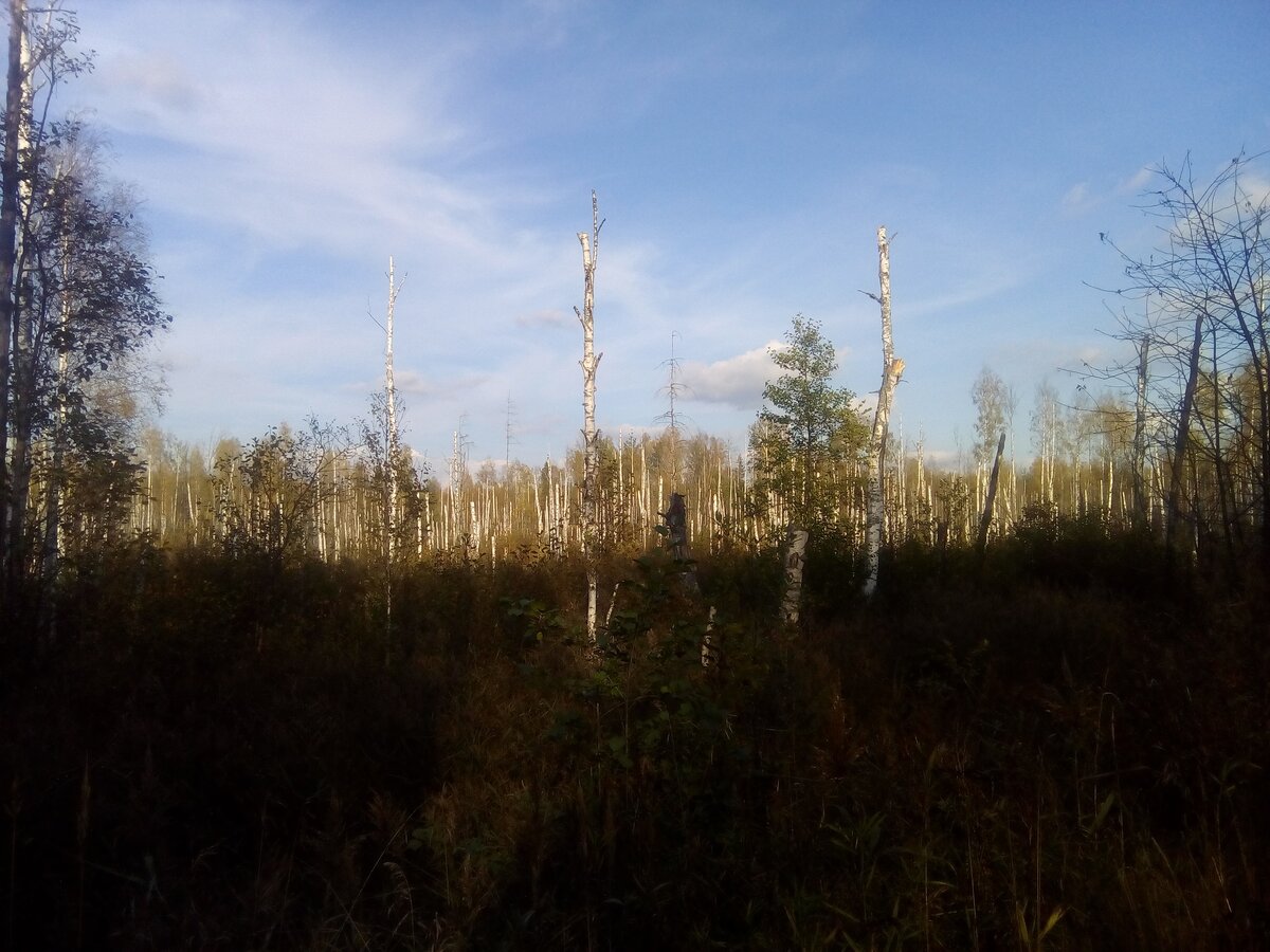 Место, которое Вы увидите на фотографиях в этой статье, находится в Кировской области, мкр. Каринторф, район "Землянок", в сторону бывшего Третьего поселка по бывшей узколейке, примерно в двух километрах от разъезда "Землянки" и дороги на Третий поселок. Об этом месте Вы не найдете никакой информации в сети Интернет, так как видимо местные не особо обращают внимания, как это часто бывает вообще во многих подобных местах, ну а чужаки практически в тех местах там не появляются. С левой стороны дороги, лесной массив из преимущественно берез обрывается прогалиной - стоят стволы берез разной высоты от 2-3 метров до 10. Веток преимущественно нет, в основном стволы. При взгляде, складывается впечатление, что большинство верхушек срезано (спилено). Площадка при обзоре с земли выглядит , как полукруг. Местность болотистая. На противоположной стороне преимущественно березовый лес в целости и невредимости. На фото трудно определить количество березовых стволов, но в живую можно насчитать боль