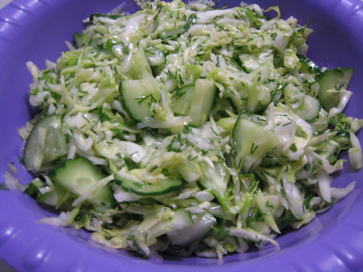 Приветствую вас, уважаемые подписчики и гости моего канала. Сегодня хочу напомнить вам один из самых простых рецептов настоящего весеннего салата, который очень просто приготовить, а аромат и вкус его мало кого оставит равнодушным. Пришли выходные, мы собрались на пикник жарить шашлыки и вспомнили про этот салат, который, по моему мнению, идеально подходит к жареному мясу и отварной молодой картошечке. У тещи в деревне его называют "силос" и готовят весной довольно часто. Мне он никогда не приедается, легкий, ароматный и очень вкусный, он всегда найдет за столом своих почитателей. Итак, переходим к ингредиентам. Для приготовления нам понадобится: половина кочана молодой капусты, пара свежих огурцов, два зубчика чеснока, небольшой пучок укропа, столовая ложка 9% уксуса, соль по вкусу и растительное масло для заправки. Чеснок очищаем, огурцы и зелень моем. Для начала шинкуем молодую капусту и кладем ее в миску, где будут смешиваться все составляющие салата. Солим капусту по вкусу, переме