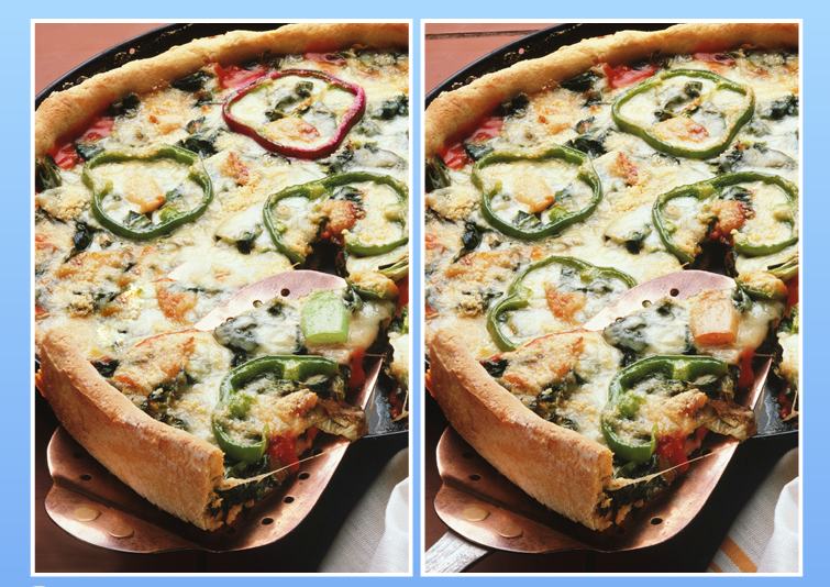 На картинку с аппетитной пиццей мы спрятали несколько деталей. Сможете найти их все? Итак, перед вами 2-е картинки,ваша задача найти 7 отличий!