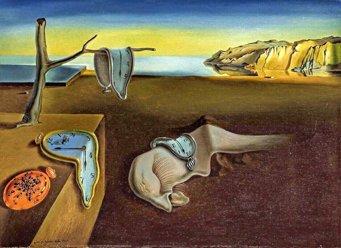 Сальвадор Дали. Постоянство памяти. 1931 г. 24х33 см. Музей современного искусства, Нью-Йорк (МОМА). Вспоминая Дали, мы волей-неволей думаем именно о картине «Постоянство памяти». Вся картина пропитана множеством противоречий. Начнём с цвета. На картине много коричневых оттенков. Они горячие, что усиливает ощущение пустынности. Но это жаркое пространство разбавлено холодным голубым цветом. Таковы циферблаты часов, море и поверхность огромного зеркала. Изогнутость циферблатов и веток сухого дерева находятся в явном контрасте с прямыми линиями стола и зеркала. Видим мы и противопоставление реальных и нереальных вещей. Сухое дерево реально, а вот плавящиеся на нем часы – нет. Море вдали реально. А вот зеркало с него размером в нашем мире вряд ли встретишь. Такое смешение всего и вся наводит на разные мысли. Думается и про изменчивость мира. И про то, что время не приходит, а уходит. И про соседство реальности и сна в нашей жизни. Каждый задумается, даже если ничего не знает о творче