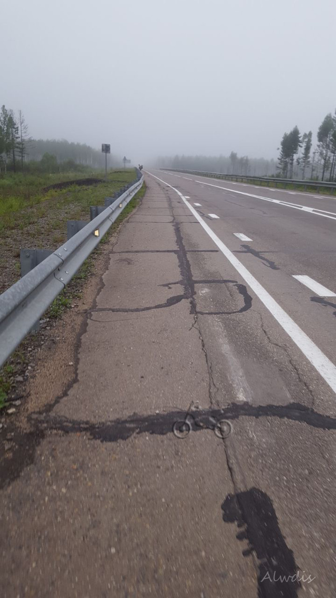 "На помойках всегда можно найти что-то полезное"- высказал предположение кто-то из ребят. "Все бы ничего, но мы посреди тайги, дело к вечеру и помойки тут не наблюдается"- ответила я, слабо представляя к чему этот разговор. "Значит ищите на обочинах. Что-то, чем можно было бы перемотать цепь" Вариант, конечно. Полезли изучать ассортимент придорожного мусора. Кроме фантиков и использованных салфеток ничего не нашли. Внезапный возглас: "О! Дорожный знак!",- нарушил медитативный процесс блуждания вдоль трассы. А тем временем, густой душистый лес, уходящее в горизонт полотно трассы, постепенно опускающийся туман и гулкая тишина стали нашими соседями. Ощущение, что находишься с другом мире, на необитаемом острове. Редкие машины, проезжавшие в попутном направлении совершенно нами не интересовались. Несмотря на разложенные вещи, инструменты и три мотоцикла, довольно странно запаркованные прямо вдоль отбойника. Ни одна не остановилась узнать что стряслось. Я успела созвониться с Дэвилом, реб