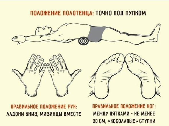 Буквально пять минут в день для занятий, и очертания вашего тела ощутимо изменятся, талия станет тоньше, а спина – ровнее. Техника выполнения упражнения: Сделайте из полотенца тугой валик 40 см в длину и 7–10 см в толщину. Перевяжите его, чтобы он не разматывался. Сев (лучше на пол) и положив валик за спиной, аккуратно опуститесь на спину, придерживая валик руками так, чтобы он оказался точно поперек тела под поясницей – ровно под пупком. Очень важно точно разместить валик. Дальше следует развести ноги на ширину и стопы подвести друг к другу,