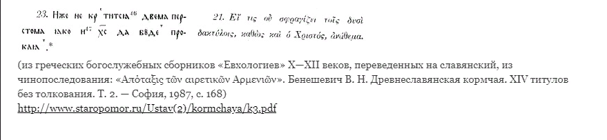 "Пидалион"(греческая новообрядческая *Кормчая*), стр. 229, изд. 1888г. толкование на 91 правило Василия Великого: "Древние христиане иначе слагали персты для изображения на себе креста, чем нынешние, то есть изображали его на себе двумя перстами, средним и указательным, как говорит Петр Дамаскин."Из сохраненных в церкви догматов и проповеданий, некоторыя мы имеем от письменнаго наставления, а некоторыя прияли от апостольскаго предания, по преемству в тайне, и те и другие имееют едину и ту же силу для благочестия. И сему не воспрекословит никто, хотя мало сведущий в установлениях церковных. Ибо аще предприимем отвергати неписанные обычаи, аки не великую имющие силу: то неприметно повредим Евангелию в главных предметах, или паче сократим проповедь в единое имя без самыя вещи. Например, прежде всего упомяну о первом ... знаменались образом креста, кто учил сему писанием?..Ибо какое было бы приличие, писанием оглашати учение о том, на что непосвященным в таинство и воззрение не позволите