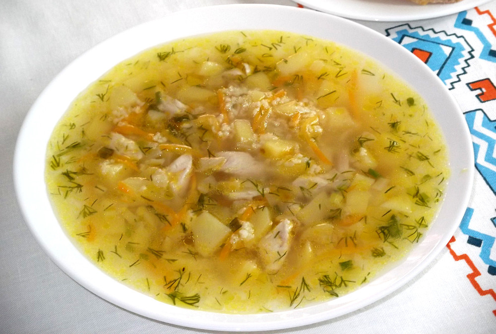 Необходимые ингредиенты: Говядину нарезать небольшими кусочками. В кастрюле разогреть растительное масло. Добавить говядину и жарить до готовности. Лук мелко нарезать. Картошку и помидор нарезать небольшими кубиками, морковь соломкой. Когда говядина будет готова в кастрюлю добавить куриный бульон. После закипания бульона добавить рис, картофель, лук, морковь, помидор. Посолить и поперчить. Добавить лавровый лист и перец горошком. Варить 15-20 минут. Затем добавит кукурузу и зеленый горошек. Варить 5 минут.