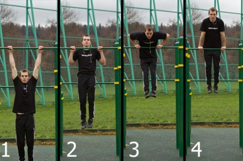 Для начала, давайте разберем из чего состоит данный элемент, а именно выход силой на 2 руки. 1)Взрывное подтягивание до груди. 2)Резки рывок руками, чтобы вывести локти вверх. Именно из эти двух элементов состоит выход силой на 2 руки. Для начала, нужно подтянуть свою физику на турнике, а именно - подтягиваться хотя бы 10 раз минимум. Но, мы здесь учим выход на 2, поэтому будем сразу задействовать взрывные подтягивания. Взрывные подтягивания. Тоже самое что обычные подтягивания, только рывок идет до груди и выше. Именно это упражнение даст вам взрывной рывок, который нужен для выхода на 2 руки. Практикуйтесь в этом упражнении, чтобы делать хотя бы 7-10 взрывных подтягиваний. Теперь разберем 2 элемент, а именно рывок локтями. Нам поможет отличное упражнение - отжимание на турнике. Отжимание на турнике. Исходное положение сверху, а именно мы должны на вытянутых руках уже быть на турнике. Сам турник должен быть на уровне груди. Ноги прижмите вместе. Начинаем отжиматься, то есть опускаться