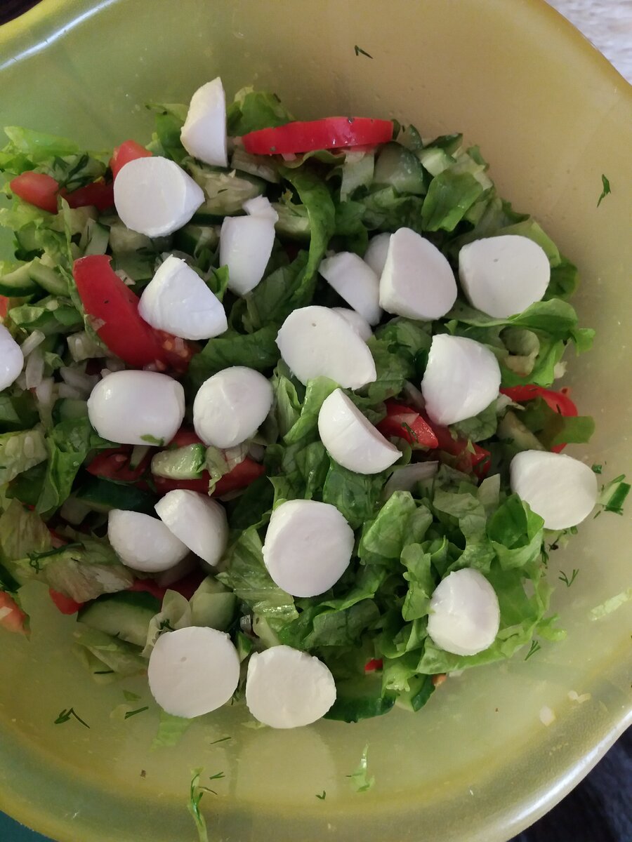 Овощные салаты очень полезны и вкусны. Они содержат много витаминов и минеральных веществ , они мало калорийны и не вредят фигуре, поэтому подходят для диетического питания. Хочу предложить вам приготовить простой салатик с овощами , готовится элементарно. Ингредиенты. 1 пучок листового салата. 2 огурца. 3 помидоры. лук . укроп, петрушка по 0.5 пучка. растительное масло - 1 ст ложка. сыр мацарелла - 100 гр. соль, перец по вкусу. Приготовление. Овощи вымыть , листовой салат ополоснуть. Все промокнуть бумажным полотенцем. Все овощи режем произвольно и выкладываем в глубокий салатник. Заправляем растительным маслом , добавляем сыр мацареллу. Солим и перчим , все наш изумительный салат готов . Приятного аппетита!