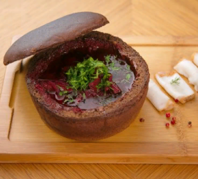 Представьте себе, вы приготовили вкусный борщ в ароматном бородинском хлебе, кто ж от такого может отказаться? Кстати мы делали его на праздник и покупали каждому небольшие булочки, получалась хлебная тарелка, которую потом вместе с ним и кушали, тем самым и посуду мыть не пришлось. Пока вариться борщ нам нужно подготовить хлебушек, чтобы он не впитал в себя весь бульон и попросту не развалился. Для этого срезаем шапку и вынимаем мякиш. Затем смешиваем яйцо вместе с солью, взбалтываем и с помощью кондитерской кисти смазываем станки внутри. Обязательно убедитесь в том, чтобы стенки были не толще и не тоньше 2,5 см. Затем ставим в духовку на 5-7 минут при 180 градусах, образуется пленка, которая будет удерживать наш суп. Осталось лишь положить борщ. Не наливайте до краёв, кто захочет возьмёт добавки. Саму булочку натрите чесноком и сверху на супчик посыпьте зелени, аромат будет ярким. Приятного вам аппетита!