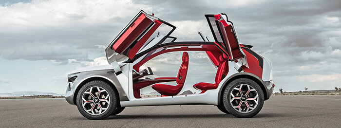 Концепция Kia HabaNiro (см. Выше) это полностью электрический, полноприводный, четырехместный автомобиль, который теоретически проезжает 300 миль (483 км) на зарядке, обеспечивает полностью автономный (уровень 5) режим движения и спортивные двери с крыльями-бабочками. Kia утверждает, что это не полный кругозор в концепции неба, а «предсказательный взгляд в будущее мобильности». Традиционные элементы управления были заменены полноразмерным дисплеем с лобовым стеклом (HUD), управляемым сенсорным инструментом панель, которая позволяет пользователям проводить и перемещать параметры через HUD. Новая система адаптивного вождения в режиме реального времени (R.E.A.D.) от Kia (выпущенная ранее в этом году на CES) позволяет системе слежения за глазами (ETS) HabaNiro отслеживать, куда смотрит водитель. Если они смотрят на верхнюю часть ветрового стекла, где будет расположено обычное зеркало заднего вида, система может активировать видеосигнал заднего обзора на 180 или сделать А-образные стойки