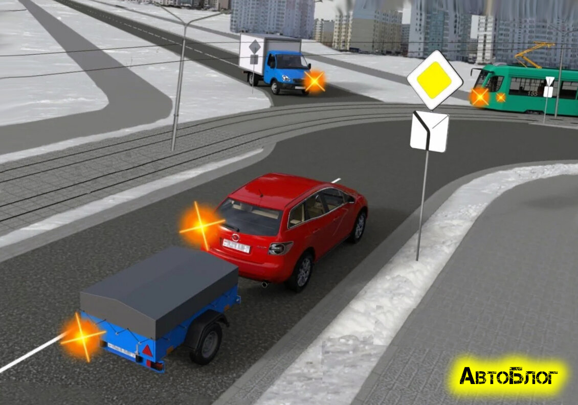 Данная ситуация довольно часто встречается на городских дорогах, и неопытному водителю или водителю, подзабывшему правила дорожного движения, сразу трудно определиться, как правильно поступить. Бытует мнение, что у общественного транспорта при движении есть преимущества перед остальными транспортными средствами. И лучше уступить им дорогу, чем спровоцировать аварию или получить штраф за нарушение. Необходимо внимательно изучить на данном участке пути все знаки и дорожную разметку. Часто они противоречат друг другу. И тогда, согласно правилам дорожного движения, следует ориентироваться прежде на дорожные знаки, а лишь потом на дорожную разметку. Вернёмся к представленному рисунку. На нем явно показан перекресток трёх дорог. Красный автомобиль движется по главной дороге, которая уходит налево, согласно дорожному знаку. Автомобиль, по правилам дорожного, движения обозначил свое желание продолжить движение по главной дороге с помощью активации сигнала левого поворотника.