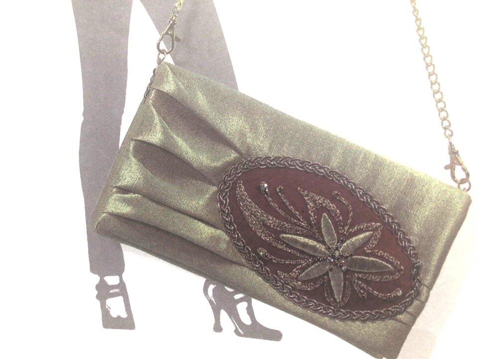 Изготовление этого аксессуара потребует от рукодельницы терпения и опыта работы, однако «Золотая лилия» стоит затраченных на нее усилий — вечерняя сумка-клатч из золотистого атласа на цепочке станет эффектным дополнением вечернего костюма. Материалы: Подготовка к работе Приступая к работе, прежде всего изготовим вышитые золотом вставки, которые послужат главным украшением комплекта. Наклеим на заправленную в пяльцы хлопчатобумажную ткань полоски замши и вырезанные из картона лепестки стилизованных цветков (рис. 60). Обошьем их золотной ниткой, воспользовавшись приемом «шитье по карте» (см. рис. 52). Далее, используя технику «китайского шитья» (см. рис. 51), вышьем лучи, окружающие цветок. Золотой шнур пришивается коричневой ниткой — это позволяет создать дополнительную игру света: между лепестками стежки расположены очень часто, и узор кажется темным, а на концах лучей они идут редко, и золотистое сияние усиливается. Сумка-клатч своими руками Вышив орнамент, закрепим стразы