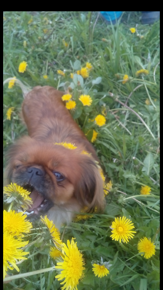 Пекинес Шелли 3. Любят ли собаки цветы Когда приношу цветы , собака бегом бежит обнюхивать, что принесли. Понюхает, и интерес сразу теряет. Но один раз принесла ветку белой акации. После продолжительного обнюхивания ветки (нами двоими), я оторвала цветок и дала его Шелли. Цветок был съеден. Надо было спасать ветку-собака начала есть акацию ( явно не голодная, мисочка всегда полна). Периодически, может полакомиться спелым бордовым клевером, выбирает самый красивый цветок Так по лугу погуляешь, уже и сыта)))). Витамины даем, собачка сытая, но явно сладкая акация и сладкий клевер пришлись ей по вкусу Очаровашка в одуванчиках.