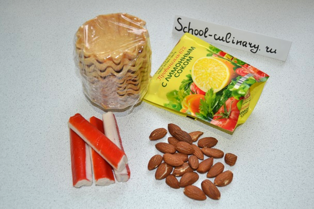 Если вы хотите приготовить что-то простое, быстрое, вкусное и оригинальное, попробуйте крабово-ореховую закуску. Этот вариант отлично подойдет как для праздничного стола, так и для внезапно заглянувших гостей. Ингредиенты: Приготовление: Вот такой небольшой набор ингредиентов мы будем использовать. Тарталетки я беру покупные, но их довольно просто можно испечь дома. Крабовые палочки вымойте, обсушите, очистите и нарежьте небольшими кубиками. Измельчите ножом орехи. У меня жареный миндаль, но можно использовать абсолютно любые орешки, которые есть под рукой. В небольшой салатник отправьте палочки. Следом – миндаль. И заправьте по вкусу майонезом. Можно добавить также немного соли и перца. Подготовьте небольшие тарталетки. Выложите закуску, дополните по желанию зеленью и подавайте к столу. Свежая и аппетитная идея, которую стоит повторить! Понравился рецепт? Подписывайтесь и ставьте лайки (палец вверх). Заранее благодарна, Надежда Ивановна