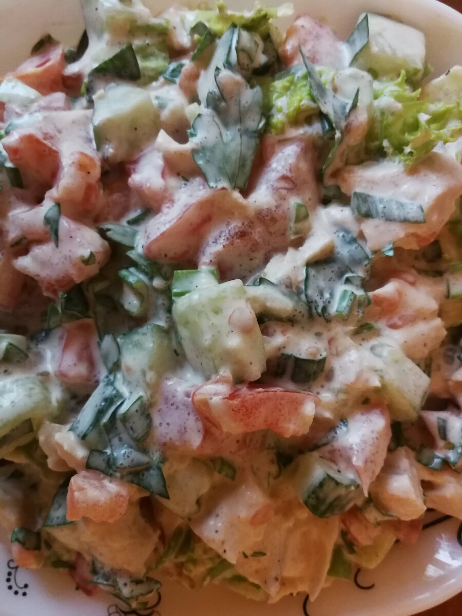 Вкусный и простой салат из грудки, помидоров и огурцов