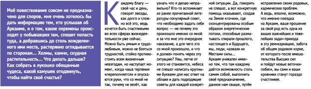 Работа Аркаима многогранна: людские проклятия, наносная бедность, вражда между кровными родственниками, болезни, отсутствие собственного жилья… и еще много того, что разрушает человека, что усложняет его жизнь. Аркаим работает с любой проблемой рода, если даже она вами не озвучена и даже если вовсе не ведома…