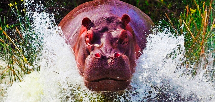 Бегемоты- одни из самых опасных животных на планете. Они легко догоняют бегущего человека, и могут потягаться в скорости даже с моторными лодками! Спастись от этого разъярённого гиганта практически невозможно. Клыки этого большого животного могут достигать величины 1 м. и более! Но как правило они варьируются в пределах 65 см. На первый взгляд может показаться, что эти животные малоподвижные и безобидные, но на самом же деле бегемоты- одни из самых агрессивных животных в мире.