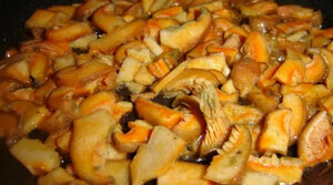 Подготовленное к готовке сырье в виде небольших кусочков опускается в подсоленную воду для пятнадцатиминутной отварки. Для того чтобы стекла вода, продукцию переваливают на дуршлаг. Сухая сковорода разогревается, грибы прогреваются до выпаривания сока.