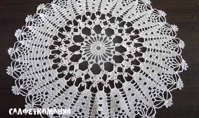 Здравствуйте, друзья! Хочу показать вам мою первую салфетку, которую я связала после длительного перерыва и с нее началась моя болезнь «салфеткомания». Салфетка крючком легкая в исполнении. Выглядит она просто, но в то же время интересно, изящно, по краям идет узор, напоминающий ракушки. И название у нее – морская или салфетка с ракушками. Пряжа у меня была – «флокс», номер крючка - 1,25. И хотя здесь всего 19 рядов, я не ожидала, что салфетка получится такой большой – 46 см в диаметре. Видимо из-за очень ажурной центральной части. Пояснения к схеме салфетки морской Все значки на схеме известные нам – воздушные, столбики с накидами и без накида. А вот в третьем ряду, что означают овальчики, было не понятно. Поэтому я тут чисто интуитивно решила вязать по три столбика с одним накидом вместе. В седьмом ряду черные овальчики – это пять воздушных петель, замкнутых в колечко (по типу пико), их нужно вязать над вершиной семи, провязанных вместе, столбиков с накидом. И аналогичный значок в 18