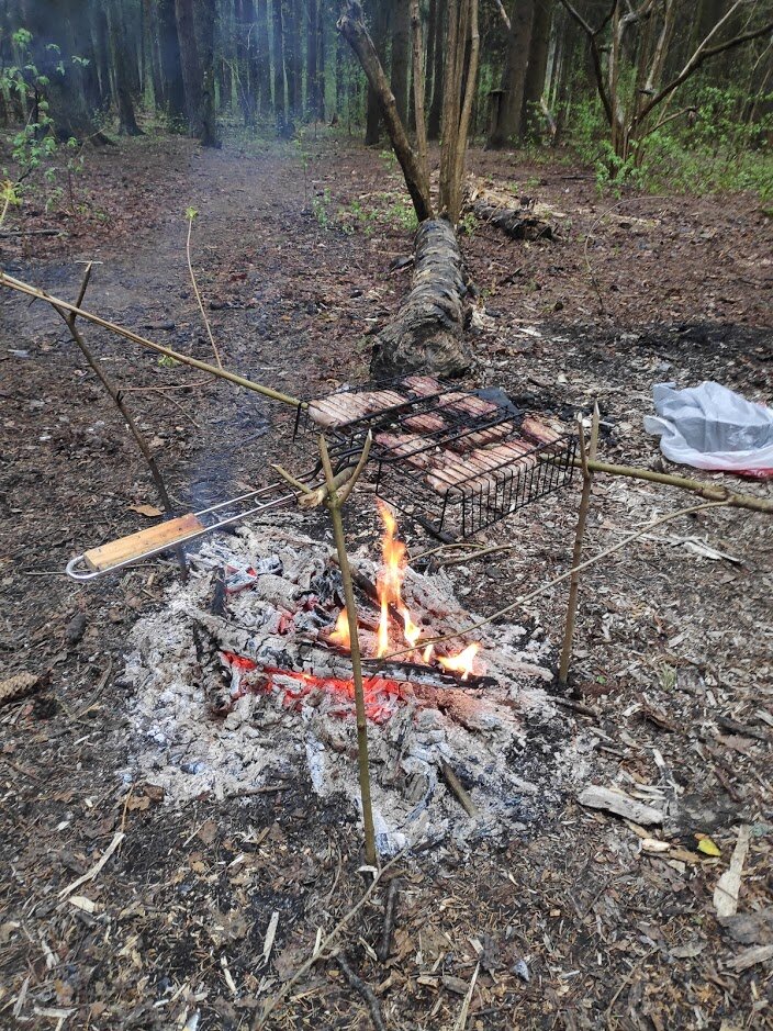 С Первого и по пятое мая у многих начинается с шашлычков походов поездок на дачу.Конечно же я тоже решил решил сходить на шашлычки.Так как погода не особо порадовала своим теплом было принято решение быстро пожарить мяско и обратно домой.Лесная полоса находится рядом с домом и вот вооружившись барбекюшницей и кастрюлей с мясом я отправился в лес.Уж очень мне надоело возиться с мангалами и шампурами я использую такой метод.Вокруг костра втыкаю три рогатинки, а их соединяю тремя прутками(но не тонкими).Над костром получается треугольник из прутков.Вот на него я и ложу барбекюшницу с мяском сначала готовим одну сторону,потом другую. Так же посетила меня белочка в прямом смысле этого слова. Надеюсь кому-нибудь такой способ приготовления мяса пригодиться.Спасибо за просмотр!