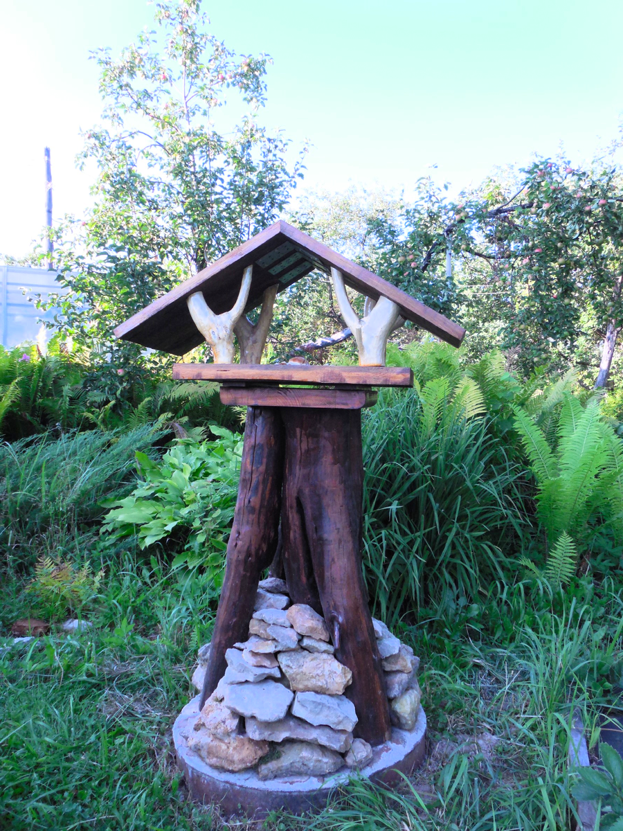 Мы долгое время обходились без птичьей кормушки. Потом сподобились повесить самодельную кормушку из пластиковой бутылки. И наконец задумались, а не сделать ли нам красивую большую кормушку… Делал кормушку брат, получилось просто супер! Мне осталось только у закреплённой на месте кормушки замаскировать камнями нижнюю часть опоры. Фото сделано через рамку, сплетённую из ... Интересно? См. здесь! Нам кормушка нравится. Птицы туда наведываются, по крайней, мере, личинки майских жуков исчезают быстро. Но надолго там пичужки не задерживаются. Подозреваю, что им-то как раз не нравится... Намного чаще (почти постоянно) мы видим пернатых около старой кормушки, которую тоже наполняем. И устрашающий персонаж из мультфильма Angry Birds их нисколько не смущает. Эта яркая штука – ёмкость из-под шампуня. Жалко было выбрасывать, и я её пристроила там. Теперь злой птиц охраняет местных пернатых. И, похоже, они довольны! Спасибо за ЛАЙК!