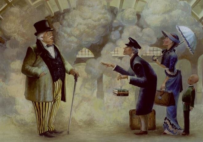 "На вокзале Николаевской железной дороги встретились два приятеля: один толстый, другой тонкий. Толстый только что пообедал на вокзале, и губы его, подернутые маслом, лоснились, как спелые вишни. Пахло от него хересом и флердоранжем. Тонкий же только что вышел из вагона и был навьючен чемоданами, узлами и картонками. Пахло от него ветчиной и кофейной гущей".