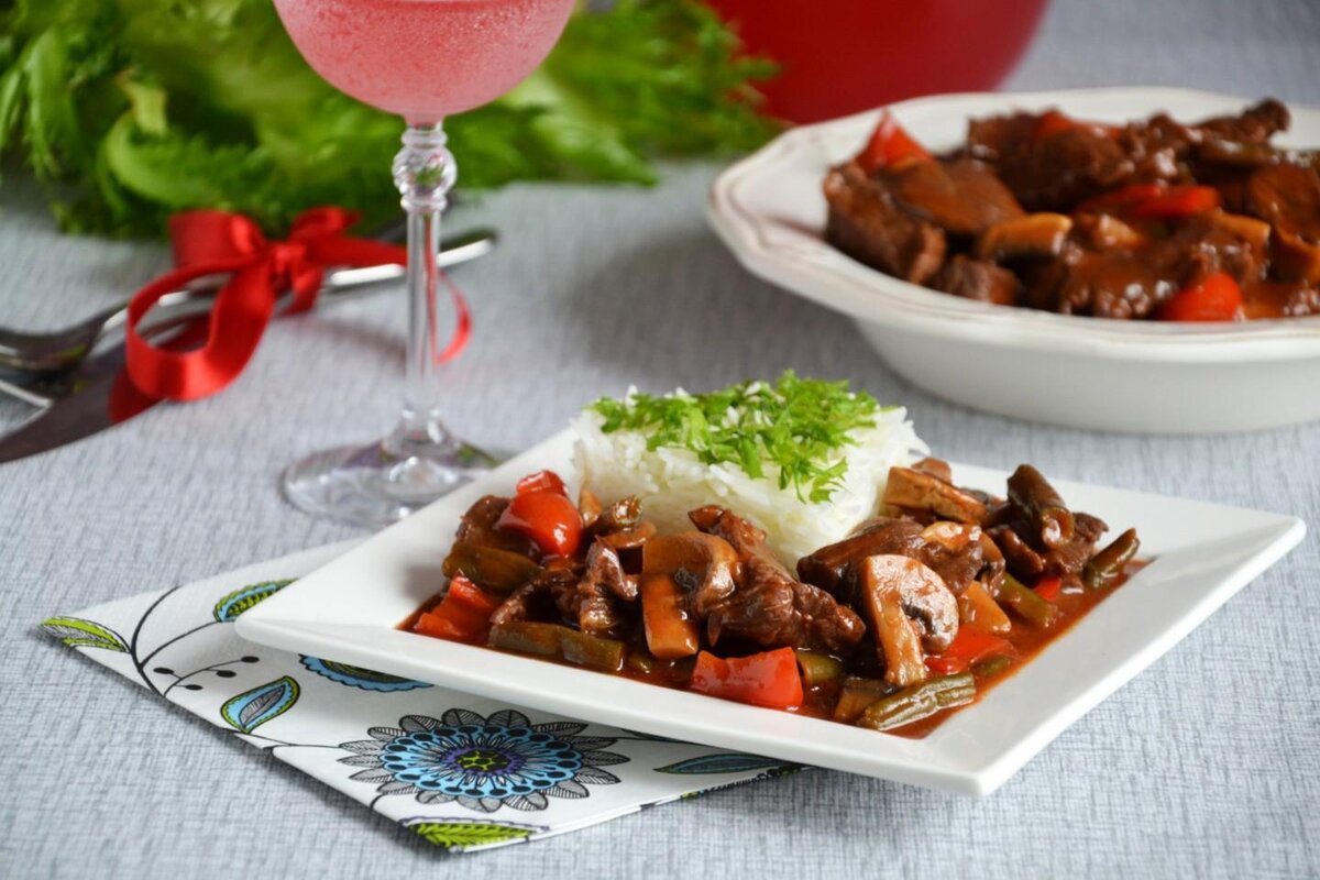 Предлагаю интересное блюдо из говядины, которое можно подать как на повседневный ужин, так и на праздничный стол. Нежное мяско плюс овощи – всегда стопроцентно вкусно. Соевый соус придаст некую экзотику и пикантность вкусу. Говядина в кисло-сладком соусе однозначно заслуживает, чтобы ее приготовить. Побалуйте себя и близких этим изысканным мясным блюдом! Время приготовления 1 ч 20 минут Калорийность 148 ккал/100 гр Ингредиенты (5 порций) · стручковая фасоль (зеленая) – 50 г; · говядина – 600 г; · сахар – 2 ст. л; · соевый соус – 100 мл; · мука – 2 ст. л; · шампиньоны – 100 г; · яблочный уксус – 2 ст. л; · томатная паста – 50 г; · растительное масло – 2 ст. л; · болгарский перец – 1 шт Подготовка ингредиентов Говяжью вырезку моем, обсушиваем салфетками. Нарезаем ломтиками. Кусочки должны быть не крупными, слегка удлиненной формы. Складываем его в мисочку. Посыпаем мукой. Заливаем соевым соусом. Отставляем в сторону на 25 минут, пусть маринуется. Разрезаем сладкий перец. Очищаем от семя