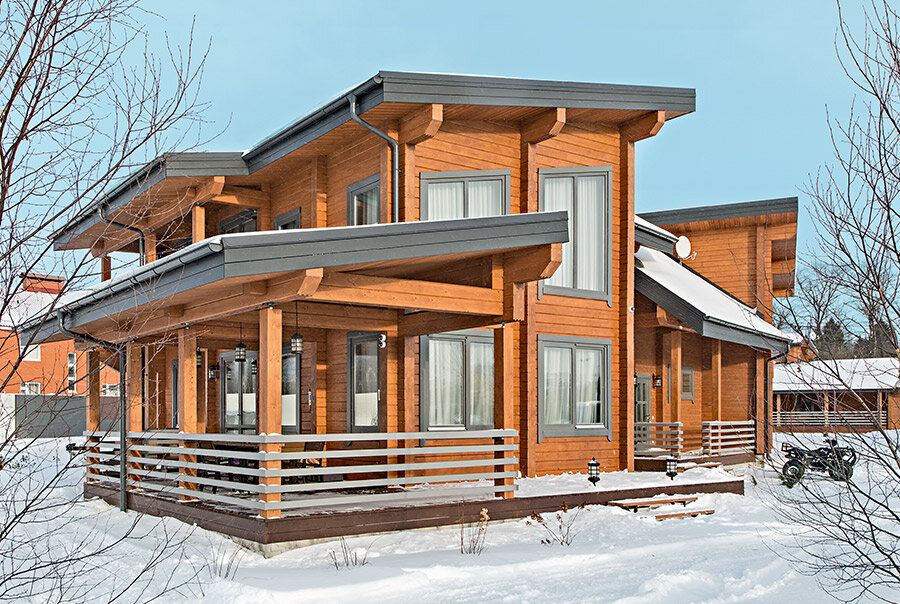 Дом из клееного бруса с современной лаконичной архитектурой возведен по индивидуальному проекту в составе усадебного комплекса на просторном участке неподалеку от подмосковной Истры. Кроме него на территории построены отдельно стоящее здание бани, гараж, мастерская — все, что нужно для полноценного активного образа жизни. Заказчик хотел, чтобы дом был нестандартным, непохожим на традиционные строения из дерева, но в то же время максимально удобным и функциональным. Эти пожелания и легли в основу архитектурной концепции. Постройка представляет собой композицию из нескольких архитектурных объемов, соединенных друг с другом под разными углами. В ее центральной части на первом этаже находятся входной блок, просторный лестничный холл и кухня-столовая, на втором уровне — библиотека. Одно крыло дома занимает двусветная гостиная с камином, из которой можно выйти на большую крытую террасу с садовой мебелью. Над ней расположен кабинет с выходом на балкон. Второе крыло дома — ж