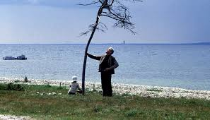 С ними там еще мальчик, который молчит, но проказничает – привязывает веревку к велосипеду почтальона и тот чуть не грохнулся. Александр, папа мальчика, advanced in years. Мальчику лет десять или меньше. Вот они гуляют и папа без умолку трындит о высоких материях, есть подозрение, что он свихнулся немного.