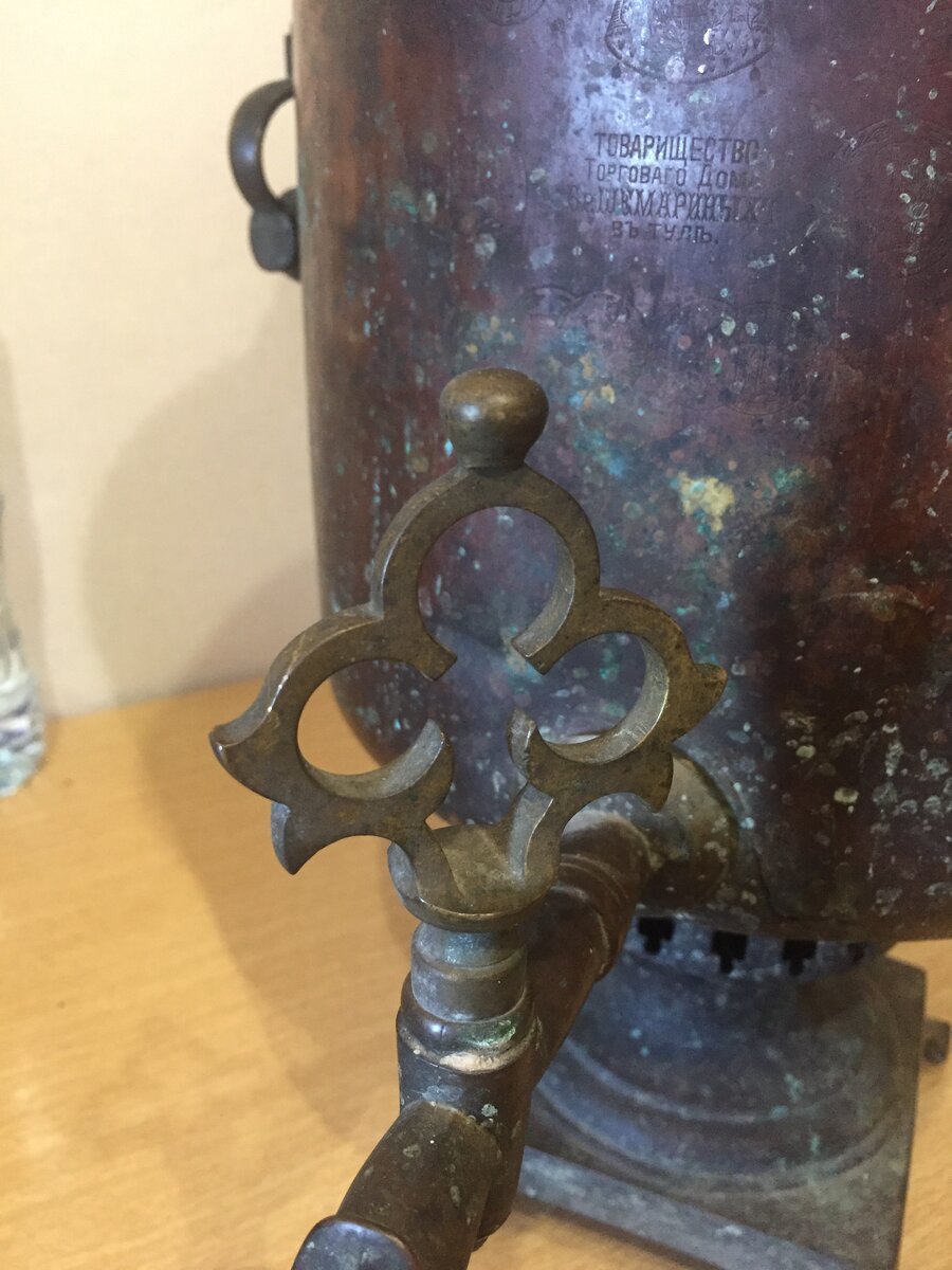 Наверное, у многих есть (остались) старинные самовары. У нас тоже есть такой. Привезли мы его из деревни и стоит он дома уже несколько лет. Так как я увлекаюсь коллекционированием (в основном монетами), то точно знаю, что такие вещи, как старинные самовары тоже коллекционируют любители. Поэтому мне стало интересно: а сколько же он может стоить? Может быть стоят себе так несколько сот тысяч рублей и пить, есть не просят =). Никто и не догадывается о них. Это, конечно, мечта, но на самом деле: сколько же стоит этот самовар? Во-первых решил его внимательно осмотреть и атрибутировать. Самовары не моя стихия, но принцип атрибуции предметов мне знаком. Нужно выявить все надписи, какие только есть на предмете, ознакомиться с ними и записать или сфотографировать. Кстати, ручки, вроде из дерева. Ещё и родные. Сам самовар не чищенный, в своей, так сказать, патине. Не знаю рабочий он или нет, нужно как-то проверять, пока ещё не дошёл до этого. Так вот, вернёмся к надписям. На лицевой стороне са