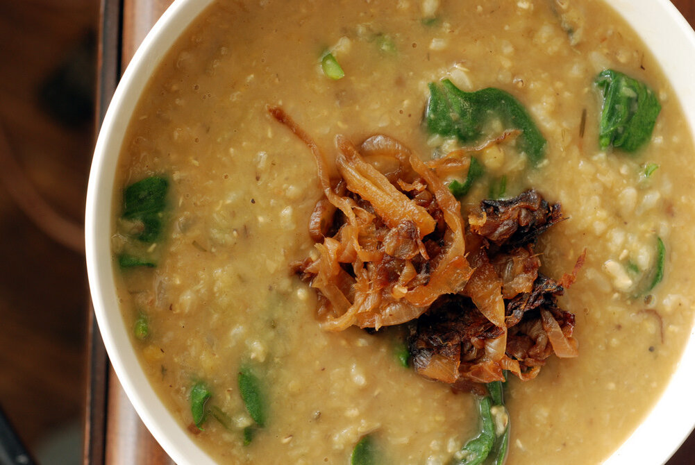 1. Лук мелко нарезать, обжарить до мягкости. Бульон довести до кипения, всыпать рис. Через 20 минут, положить нарезанный кубиками картофель, томатную пасту, лук.