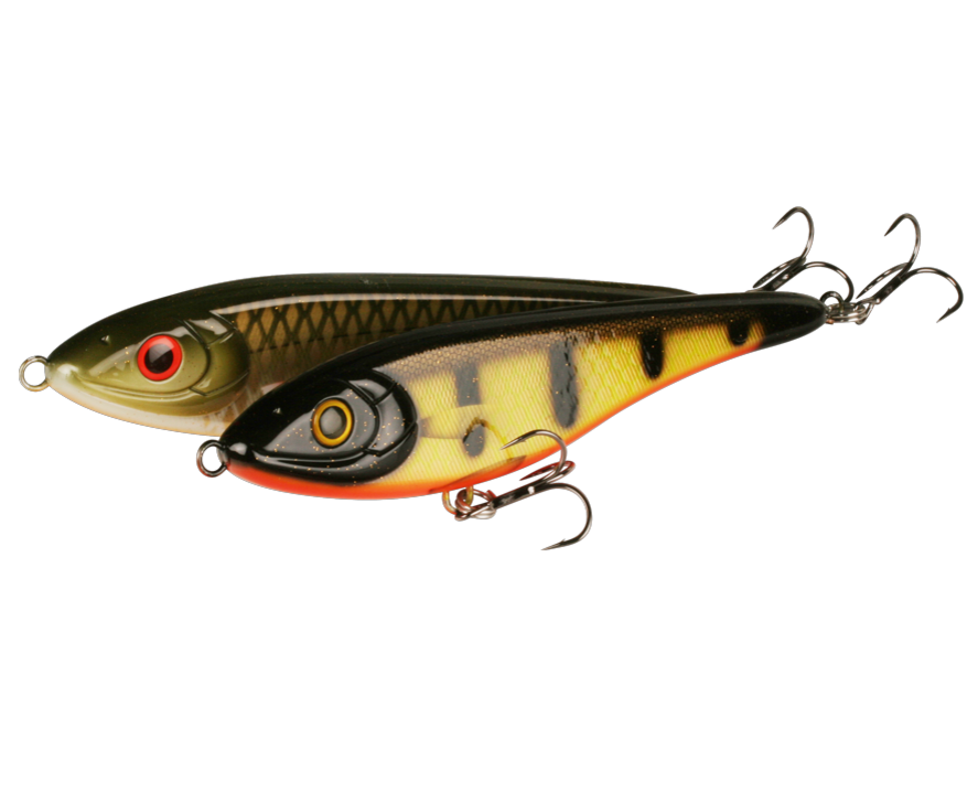 1) Strike Pro Big Bandit Shallow Runner - Джеркбейт Биг Бандит Шаллов Руннер начинает медленно тонуть (или чаще замедленно всплывать) при использовании не титанового, а металлического «поводка-скрутки» большого сечения (от 0,8мм и длиной 30см). Тем самым, изменив плавучесть на медленно тонущую, получаем очень эффективную приманку для ловли самой пассивной щуки! Все джерки оснащены тройниками Owner.