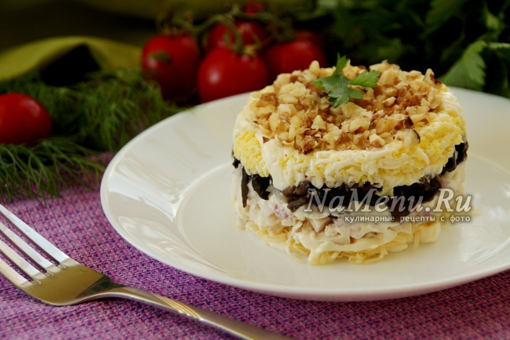 Салат «Сказка» с курицей, шампиньонами и грецкими орехами